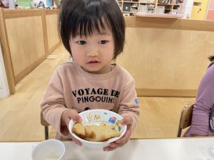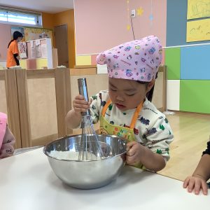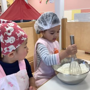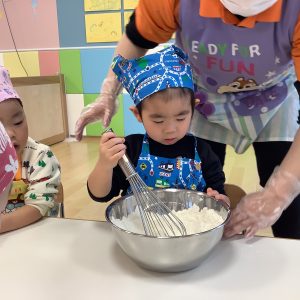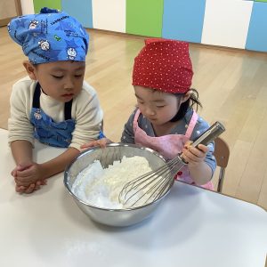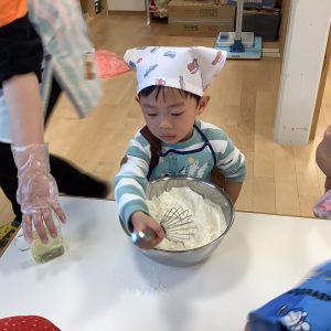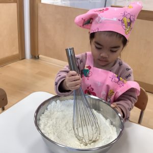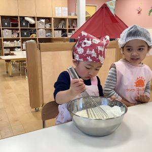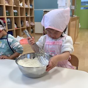 ホットケーキの粉をボウルに入れる作業に興味津々