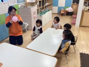 保育者の「ぺったんこぷっくらこ」の言葉のリズム感が楽しいようで夢中になって見ている子どもたち