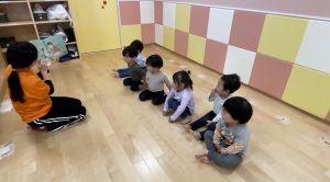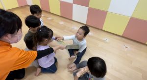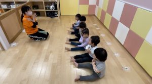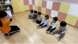 「しーしーしー静かに聞きましょう♫」のところでは、お友だちとお顔を見合わせてニコニコ笑顔で口元に1本指を持っていってシーッとしていてとっても可愛いです![]()