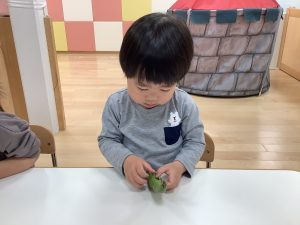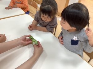 そら豆の皮の感触や匂いを楽しんだ後、みんなで皮むき![]()