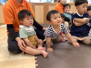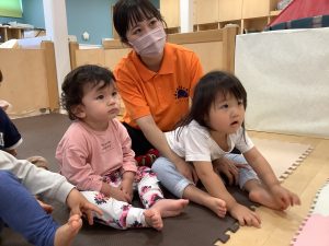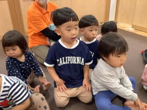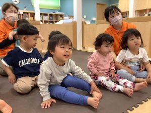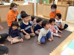 お歌に合わせていろいろな色の動物さんが出てきて子どもたちも興味津々![]()