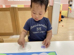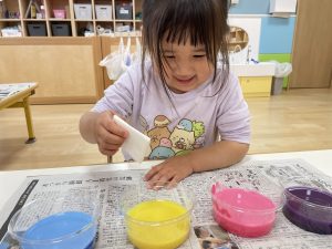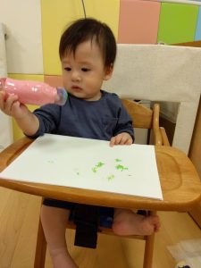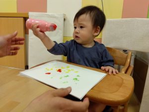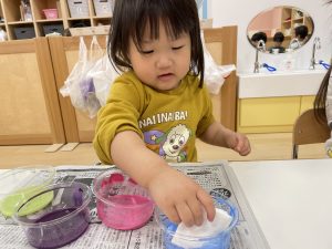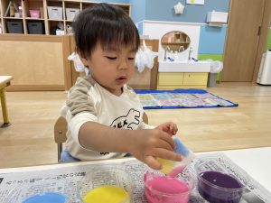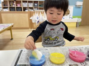 2歳児のお友だちはキッチンペーパーを使って染め紙をしました![]()