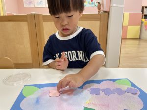 乾いた染め紙にノリでお花をぺったんこ![]()