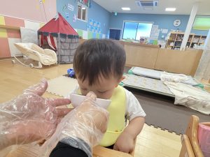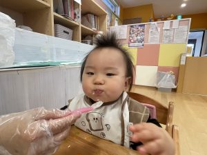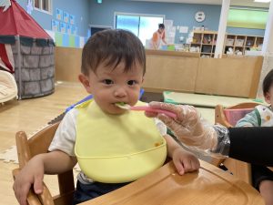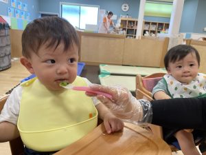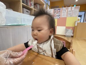 保育者に励まされると小さく口を開けて食べてくれました![]()