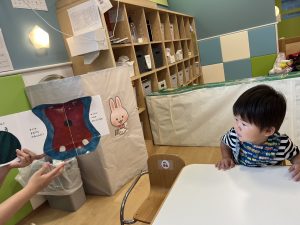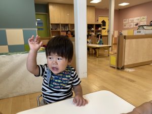 保育者が「バナナたべるのだあれ