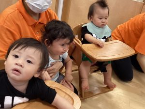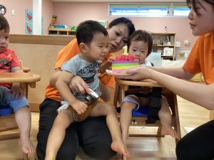 初めてのお誕生会に少し緊張の表情の0歳児のお友だち