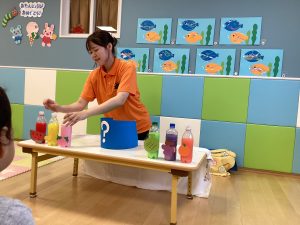 青色の魔法の筒の中に子どもたちが自分が選んだジュースを入れてもらいました