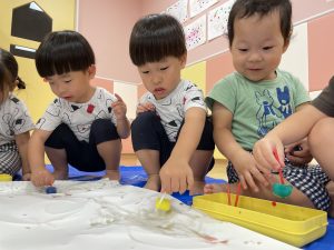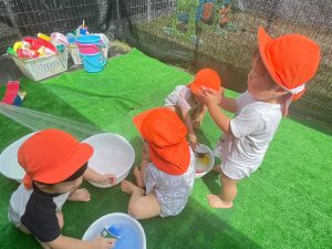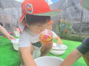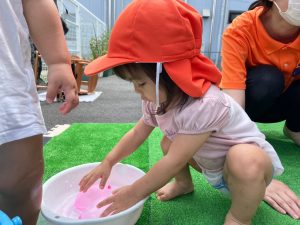 プール遊びだけでなく、色水遊びや氷遊びも楽しんでいます