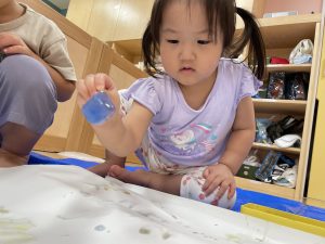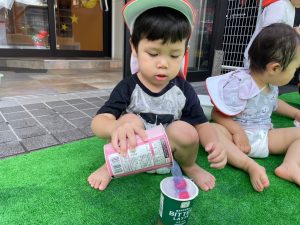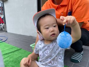 氷と水をカップの中に入れて、カップからカップへ何度も移し替えて音を楽しむ子もいました「カラカラっていい音がするね」と保育者が声をかけるとニコッと笑ってくれました