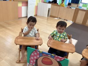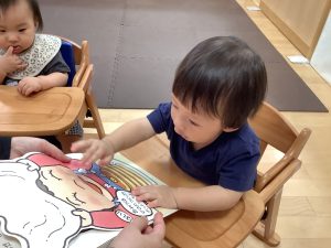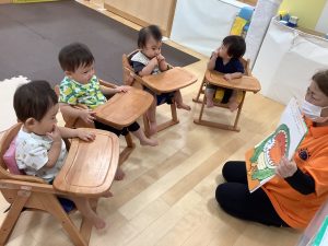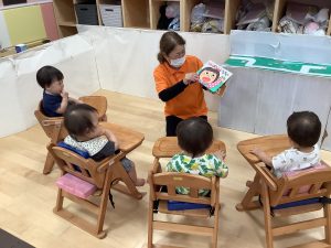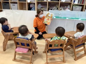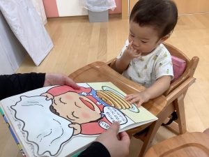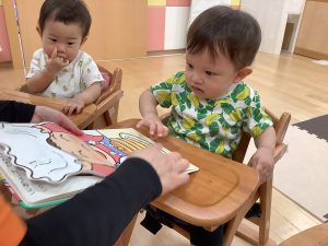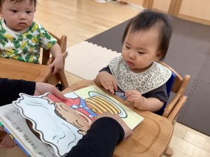 今週は【0歳児🍑もも組】さんの絵本の様子をご紹介します![]()