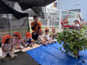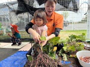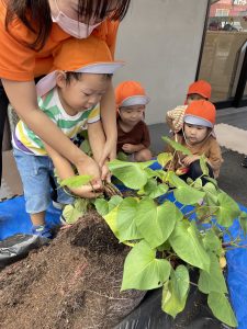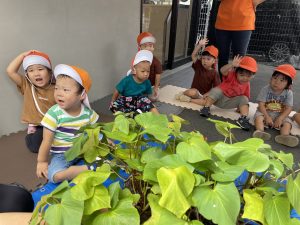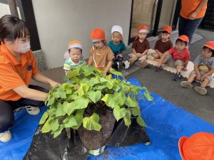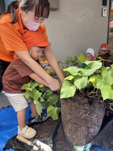 最初に「はんぶんこ」の絵本を読んで、この葉っぱの下にはサツマイモが埋まっていることを説明すると、「えーー」と子どもたちは不思議そうに反応していました