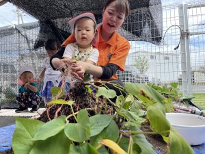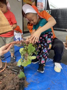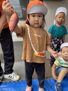 抜けたお芋を見て嬉しそう