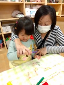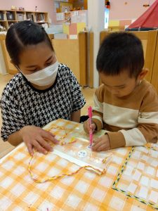 ペンのフタが難しい時はお母さんと一緒に![]()