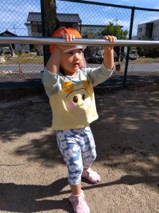 鉄棒にぶら下がるところをお母さんに披露![]()