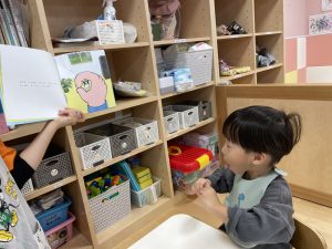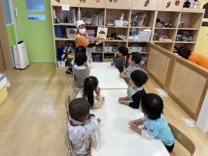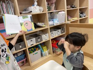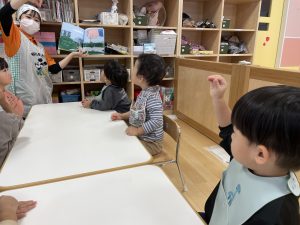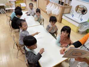 今週は【2歳児🍎りんご組】さんの絵本の様子をご紹介します
