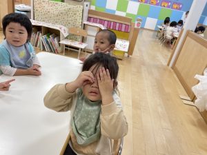 男の子が手でわっかを作って覗いている姿に何してるんだろうと不思議な表情の子どもたち