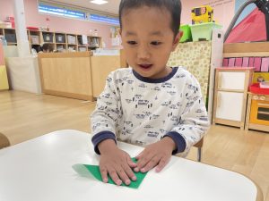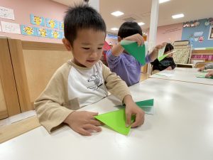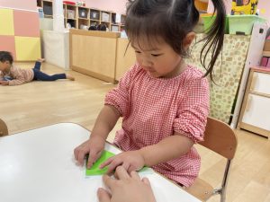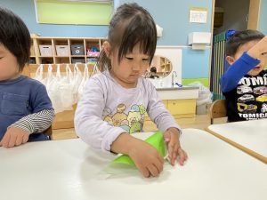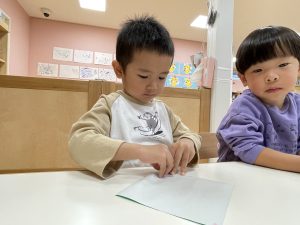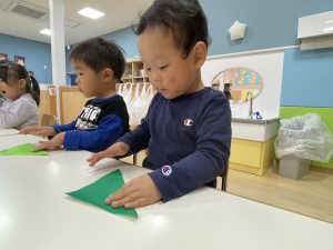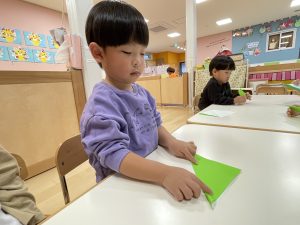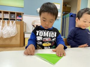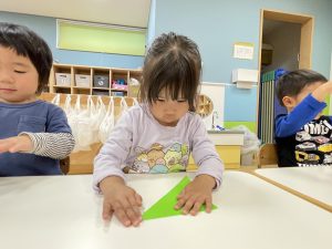 保育者のお話をしっかり聞いて、角をぎゅっと持って折ってくれていました