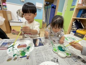 三角を3枚作り終わると、クリスマスツリーの配色をどうするかお友だちとお話しながら組み合わせてくれていました