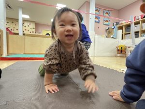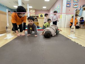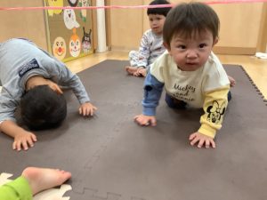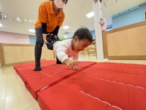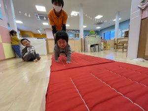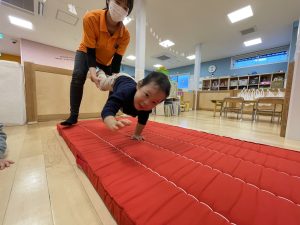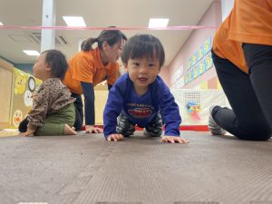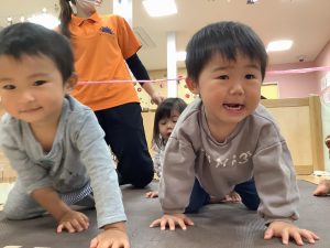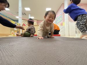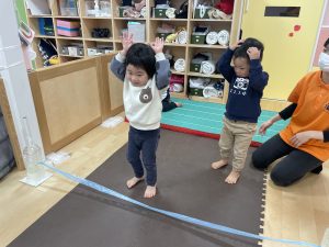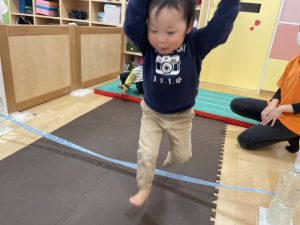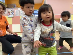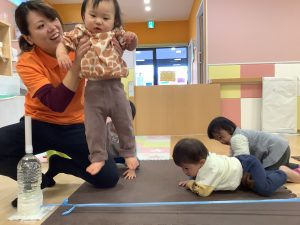0歳児のお友だちも、保育者にお手伝いしてもらって大きくジャンプ