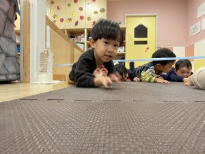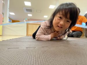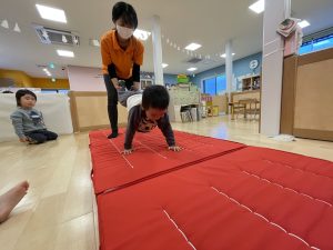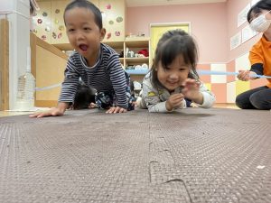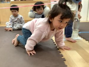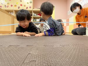 さぁ紐の下をハイハイや匍匐前進で進めるかな