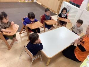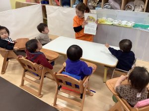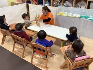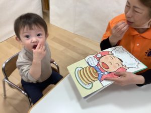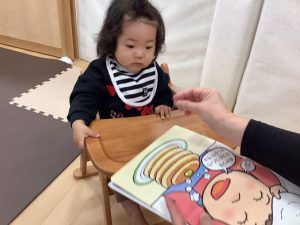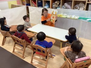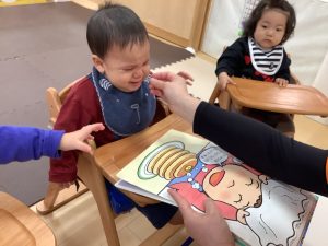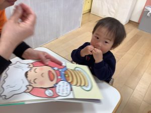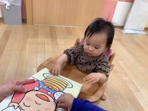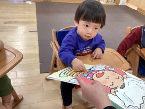 今週は【0歳児🍑もも組】さんの絵本の様子をご紹介したいと思います