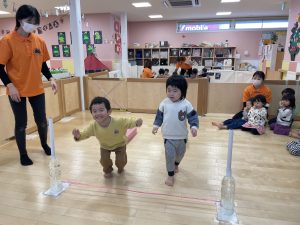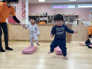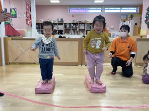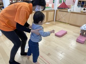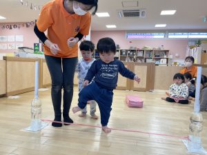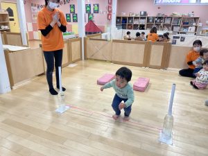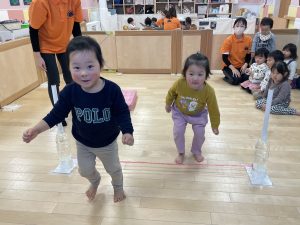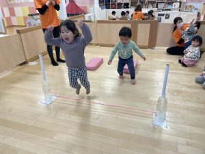 保育者に脇の下を持ってもらってのジャンプも楽しかったようで喜んでいました
