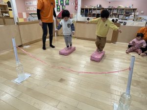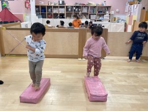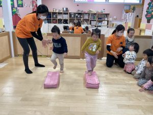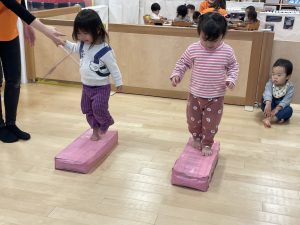 少しバランスが難しい時は保育者に手を繋いでもらう姿も