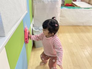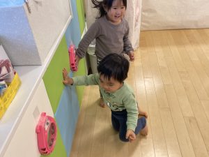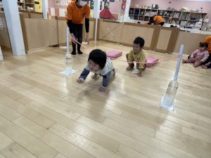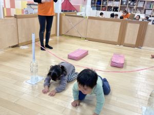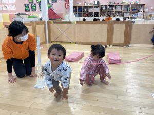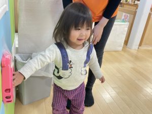 紐を上手に潜れると写真を撮っていた保育者と目が合いニッコリ