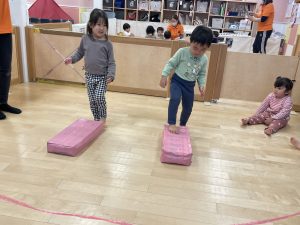 一本橋も後は大勢を低くして紐の下をくぐったり、紐を跳び越えたりしました