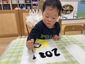保育者が鉛筆で2024と書いたところを筆でなぞります
