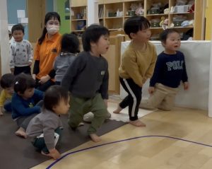 \カエルさん🐸/と言ってピアノの音に合わせてピョンピョン