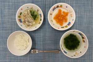 (写真は普通食です。年齢によって盛り付け量を変えて、提供しています。)