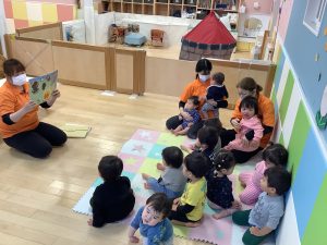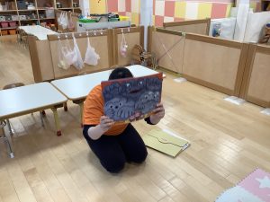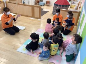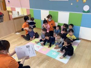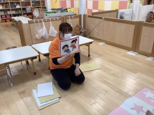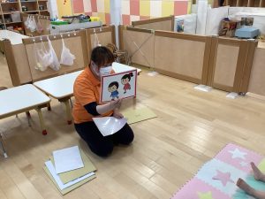 今月は子どもたちに、いろいろな災害があることや、火事の時はどんなふうに避難したら良いかなどのお話を紙芝居と視覚カードを使って知らせました