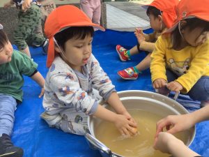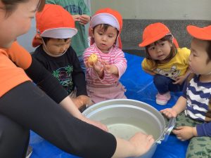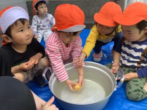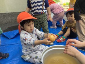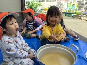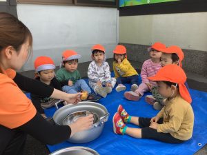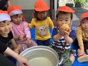 りんご組さん🍎今から、おやつに使うじゃがいもをキレイにしてもらおうと思います![]()