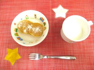 (写真は離乳食後期です。年齢によって形、固さ、盛り付け量を変えて、提供しています。)