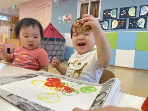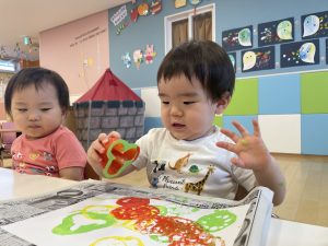 【1歳児🍓いちご組】さんは、れんこんとパプリカとピーマンのスタンプを楽しみました![]()
