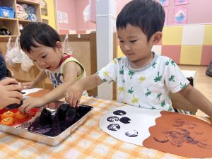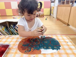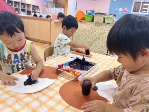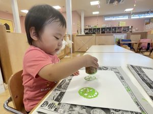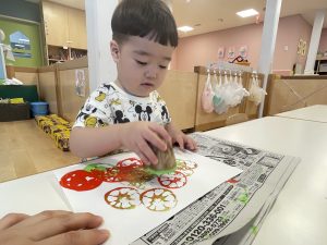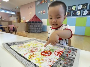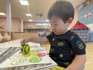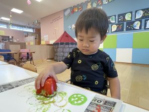 【2歳児🍎りんご組】さんは、レンコン、ナス、オクラ、にんじん、ピーマン、パプリカを使ってスタンプ遊び![]()