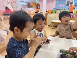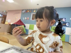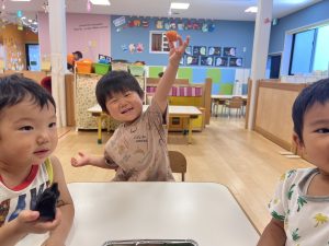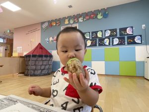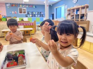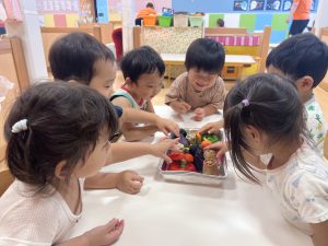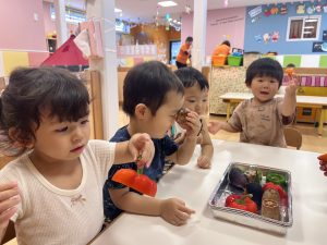 」と教えると、頑張ってお野菜の名前を真似して言おうとしてくれていました![]()