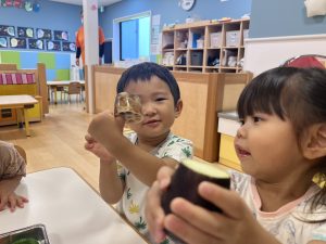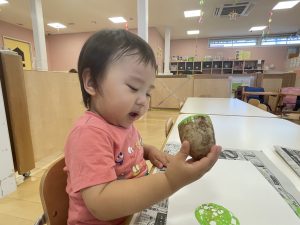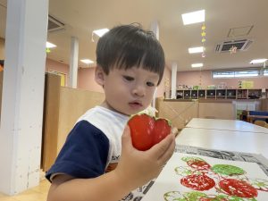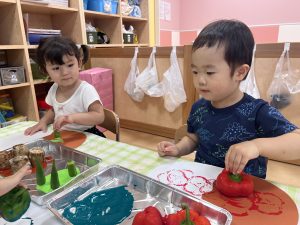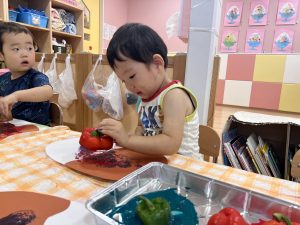 ピーマンのスタンプでは中の種の部分が気になるようで恐る恐るピーマンの中を確認する姿も![]()
