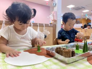 今日は【1歳児🍓】さんと【2歳児🍎】さんの野菜スタンプを使った製作の様子をご紹介します![]()