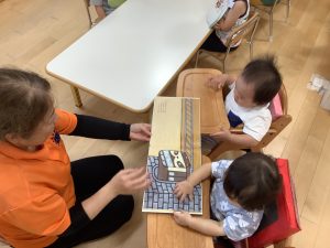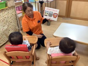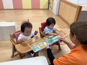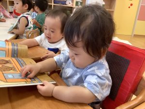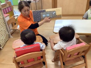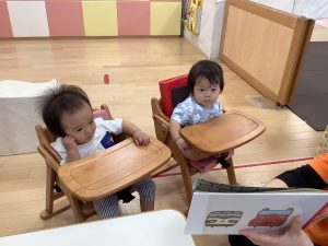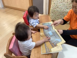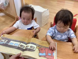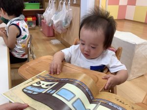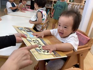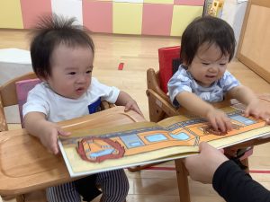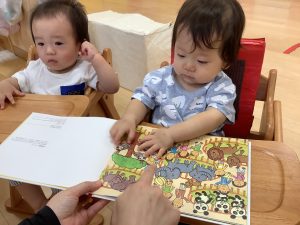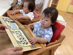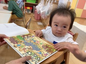 今週は【0歳児🍑もも組】さんの絵本の様子をご紹介します![]()