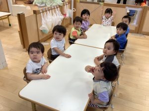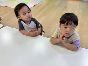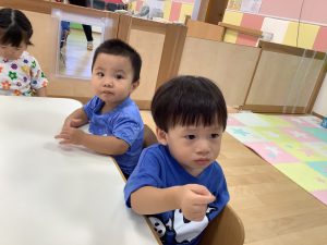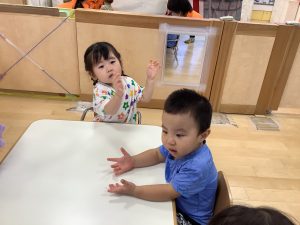 でも保育者がお名前を呼ぶと小さく手を上げてくれていました![]()