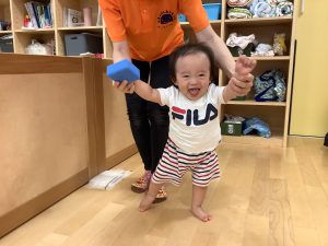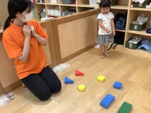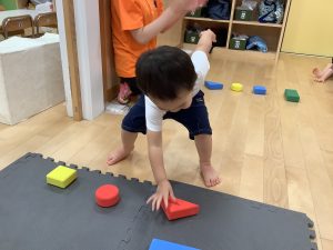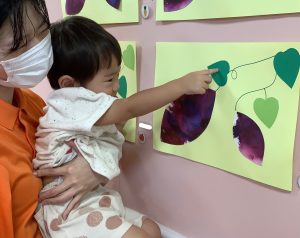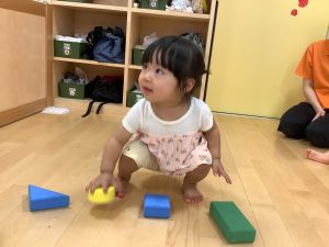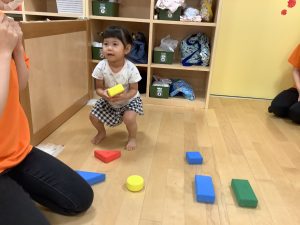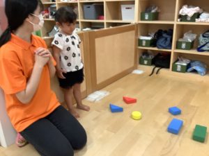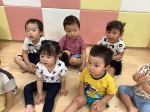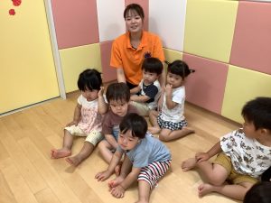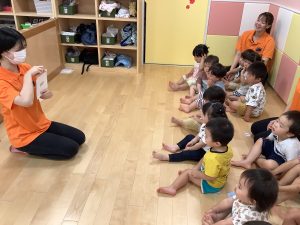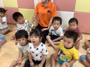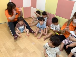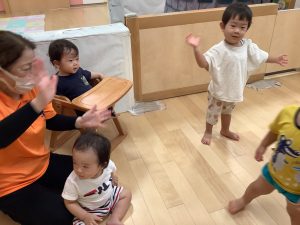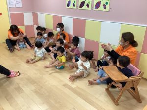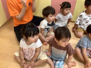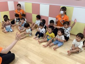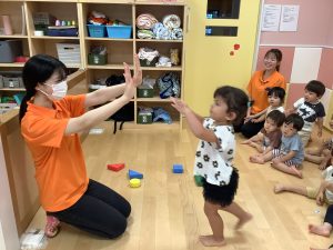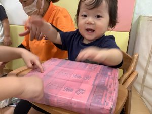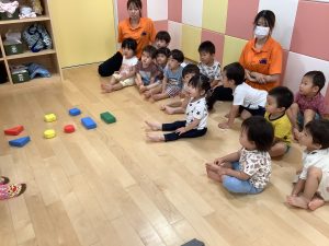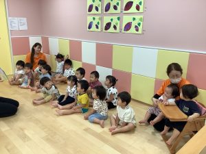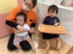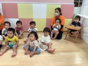 0歳児のお友だちも先生と一緒に答えて運ぶよ![]()