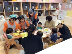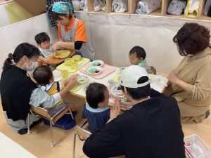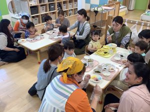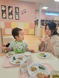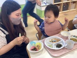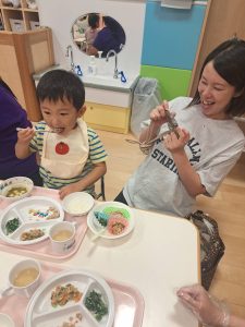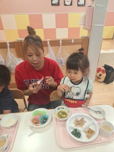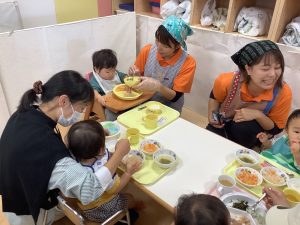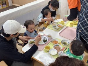 大好きな保護者の方に関わってもらいながらの給食はいつも以上においしかったようでパクパク大きなお口で食べてくれていましたよ![]()