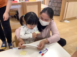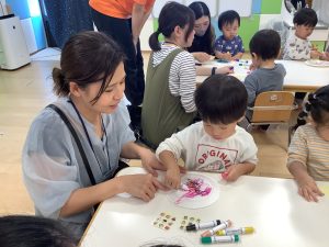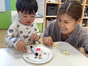 いちご組さんは紙皿にお絵描きとシール貼りをしてカスタネット作りをしました![]()