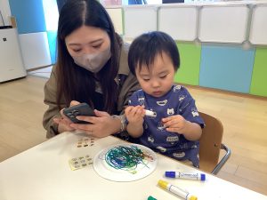 お母さんに見守られながらシールをペタペタ![]()