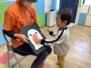 オバケさんに食べ物を食べさせてあげたいお友だちがいっぱい手をあげてくれました