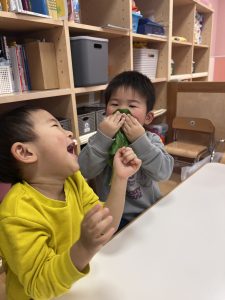 思いっきり葉っぱの匂いをかぐお友だちを見て楽しそうに笑う姿も![]()