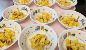 (写真は離乳食後期です。年齢によって形、固さ、盛り付け量を変えて、提供しています。)