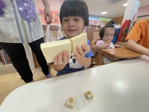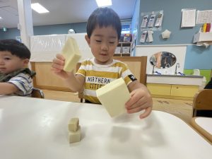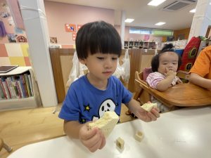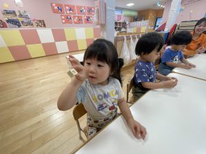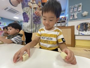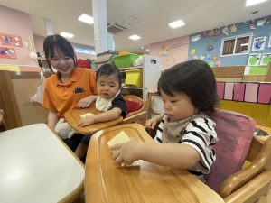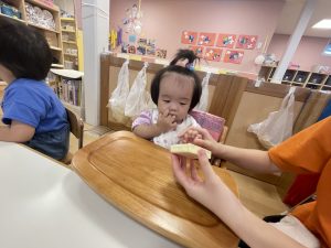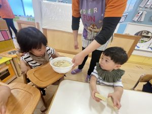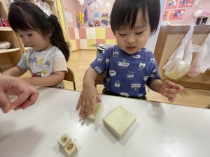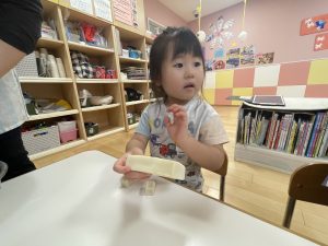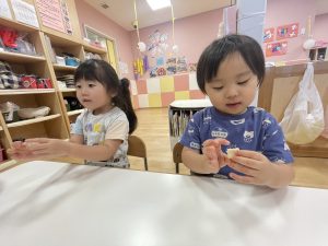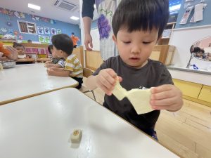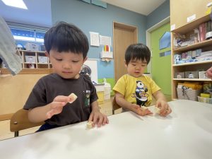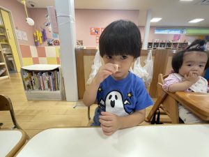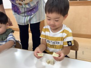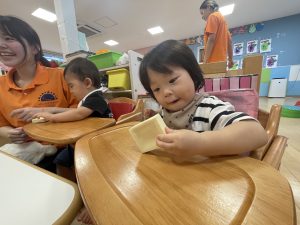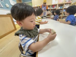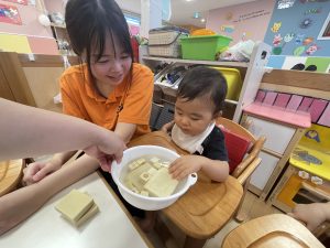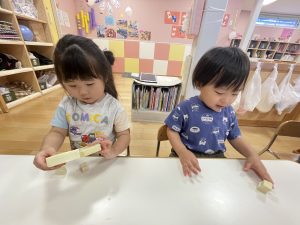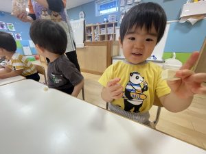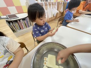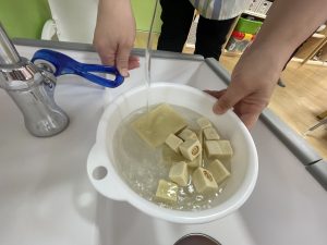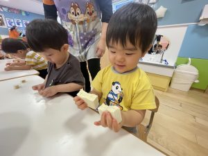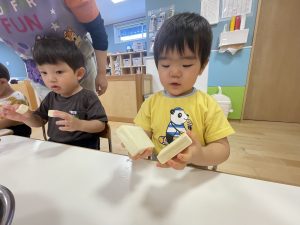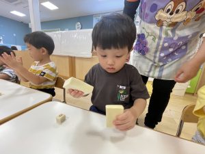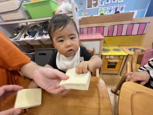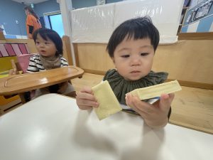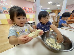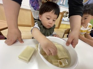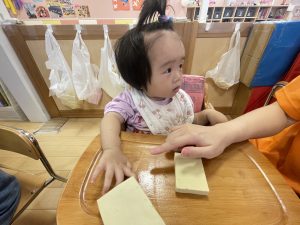 9月は0歳児さんと2歳児さんとで乾物の高野豆腐に触れてみました